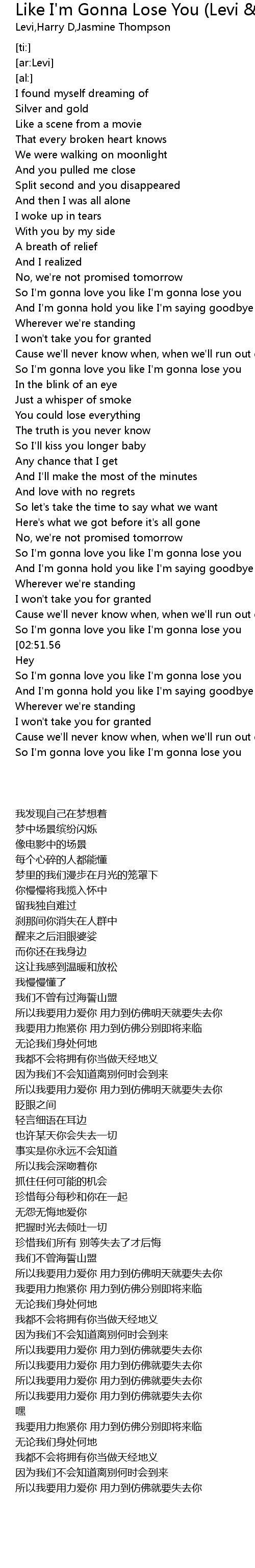 Like I M Gonna Lose You Levi Harry D Remix Lyrics Follow Lyrics F c dm7 f/g the truth is you never know c so i'll kiss you longer baby em any chance that i get am and i'll make the most of the minutes.