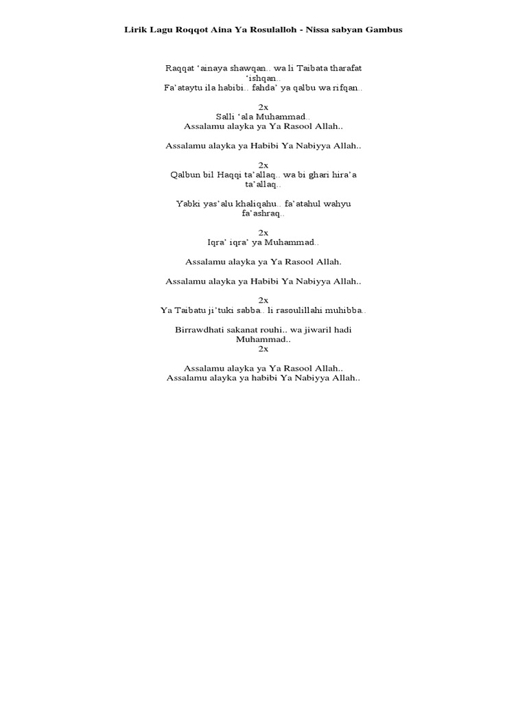 Roqqot Aina Lirik - Assalamu alayka ya ya rasool allah assalamu alayka ya habibi ya nabiyya.